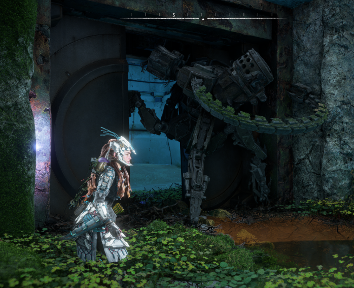 In Horizon’s case, it’s everywhere. Even the armor Aloy is wearing fits the overarching Narrative of her hunting machines. But Art and Narrative can also be seen combined in the world, for example, this door that is being held open by a machine fossil.